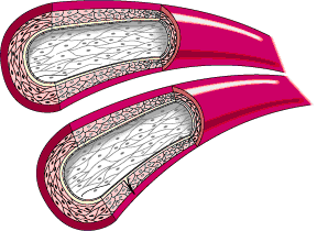 Blockages begin to occur at an early age. "Fatty streaks" can be demonstrated in teenagers. A little bit of blockage is generally harmless. If the vessel becomes narrowed by 50% or so, there can be less blood flow than needed at periods of increased need, such as exercise. When the vessel is narrowed 90%, there is the potential for lack of blood supply at rest. When the vessel becomes 100% closed, a heart attack ("myocardial infarction") generally occurs. If the vessel closes gradually, the muscle may obtain flow from other vessels ("collateral circulation"), in a sense "doing its own bypass".